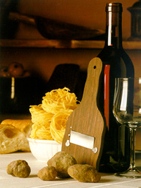 Reference was made a moment ago to the farmhouse pig. This, of course, was not reared in large feedlots as is the industrial fashion of our times, but in the skilled ways of yore. The one or two pigs each family kept were not a source of income. On the other hand they furnished a good source of extra food for the best part of the year in the form of sausages and salamis of various kinds: the great cooked salame, the "cacciatorino dolce" (very much a part of Piedmont), which was made of raw meat chopped upfresh with garlic and Barbera, and the cotechino of the Monferrato and Langhe district, soft and very tasty, to be eaten hot after a long period of cooking, accompanied by beans a la vignaiola made with tomato, sage and red wine, or on less elegant tables, Piedmontese "fonduta" or a puree of white mountain potatoes. Above all, the family "pig" supplied fine streaky flank cuts, eaten open or rolled up, but always with a fine, soft texture, in the company of garlic and aromatic herbs, as well as the condiments for every meal, namely lard, suet or dripping, the poor and tasty relatives of their richer cousin, cow's milk butter.It is important to remember that with the passage of time the day the pig was slaughtered in the farmyard became the occasion of one of the years's most important feast-days, and ritual meals, alon g with the day when the wheat was threshed (oceans of Barbera and "la minestra de bati il gran"), or when the wine was drawn from the vats to the accompaniments of a huge communal dish of "bagna cauda", consumed in great joyfulness with oceans of wine. These gave rise to series of fabulous dishes, such as "pig soup" (made with chick-peas, large white beans from the Langa, along with the animal's head, ears, snout and tail, garnished with the classic lightly fried assortment of onions, garlic, sage and rosemary chopped up with lard or bacon: a great steaming, beguilingly scented oven containing the soup and the main dish together; the "grive", "flisse" or "griselle" (pig's liver roughly chopped up with sausage meat and sometimes brain, flavoured with bay leaves, black pepper and umper berries, and made richer with yolk of egg and parmesan cheese, the whole prepared in balls as large as an egg, enfolded in a piece of the animal's belly lining, well salted and gently fried in oil and butter); the trotters turned into "batsoa" (bas de soie), in other words, as fine as silk stockings by boiling in a(court bouillon or stock composed of one-third red wine, one-third vinegar made from the same wine, and one-third water with salt, bay, black peppercorns, cloves, cinnamon and yellow lemon peel, then crumbed in egg and fine, sieved maize flour fried quickly in oil and butter so as to produce a delicious, dark golden crust. Indeed, the Piedmontese mixed fry that finds such favour with local and visiting gourmets alike in every restaurant and country tavern is certainly not a dish dating back to the time of Emanuel Philbert. Nor is it even relatively old, like that of Tuscany.