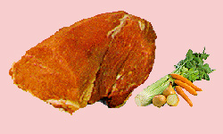 Server 4. Place a small veal rump roast (2 lb.) in a copper pot with 1 1/2 tbs, butter, 1 oz, lard, 1 onion, 1 clove garlic, 1 carrot (cubed), 1 celery stalk, 1 small bunch fresh rosemary, 1 bay leaf, 1 pinch cinnamon, salt and pepper. Cook until the meat is slightly browned, then add 1 cup Barolo wine. Simmer slowly and when the wine is almost completely avaporated, add several ladles of warm water. Cover and cook over a low heat for a bout 1 1/2 hours. Slice the meat, rub the seasoned drippings through a sieve and return both to cook. Fifteen minutes before serving, add 1/2 cup rum, serve hot.