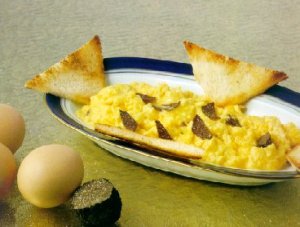 Sautè 1/4 cup minced truffles with 1 clove garling and 1 handful minced fresh parsley. Meanwhile, prepare a 6 eggs omelette, carefully flipping the omelette in the skillet so as not to break it. Salt the omelette and turn it on to a platter, pour the truffle sauce over the top and serve hot.